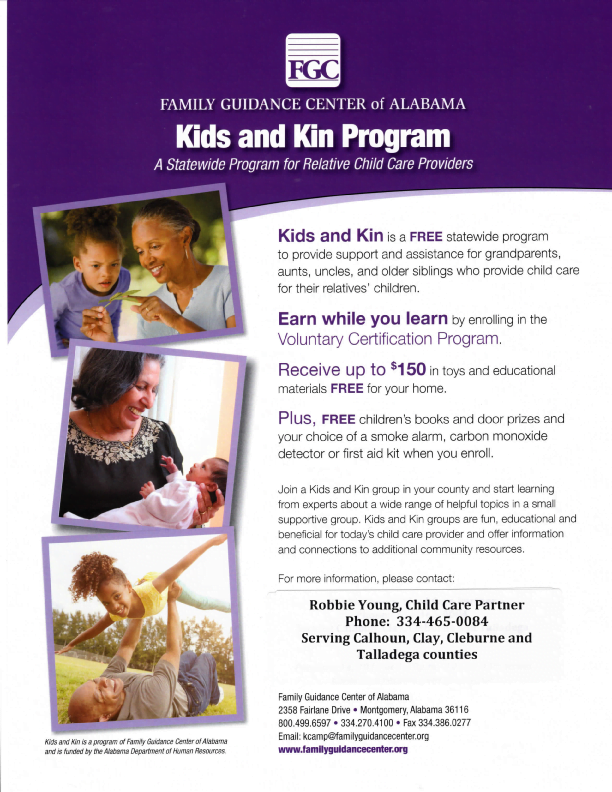 Family Guidance Center of Alabama Would like to invite you, our Relative Care Providers To Participate in the Kids and Kin Program Just Getting Started in Clay County
