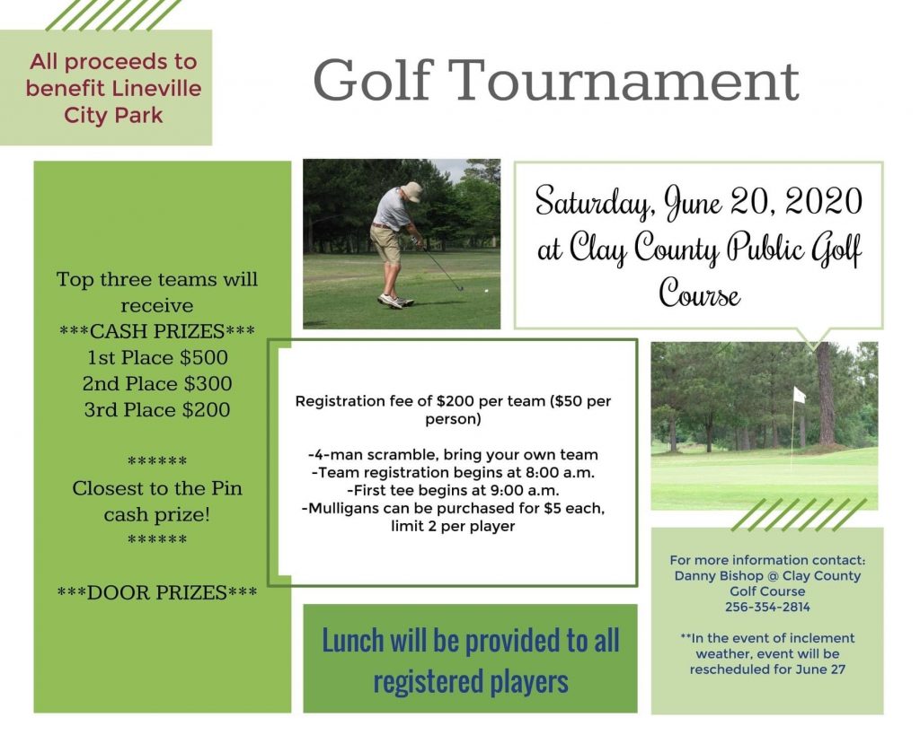 The Lineville Park and Recreation Board Golf Tournament has been rescheduled for Saturday, June 20th!!!! This is our biggest fundraiser with all proceeds to help maintain and keep our City Park beautiful. We look forward to a day of fun, there will be lots of door prizes and breakfast will be provided! Call Danny Bishop at Clay County Golf Course to register your team!